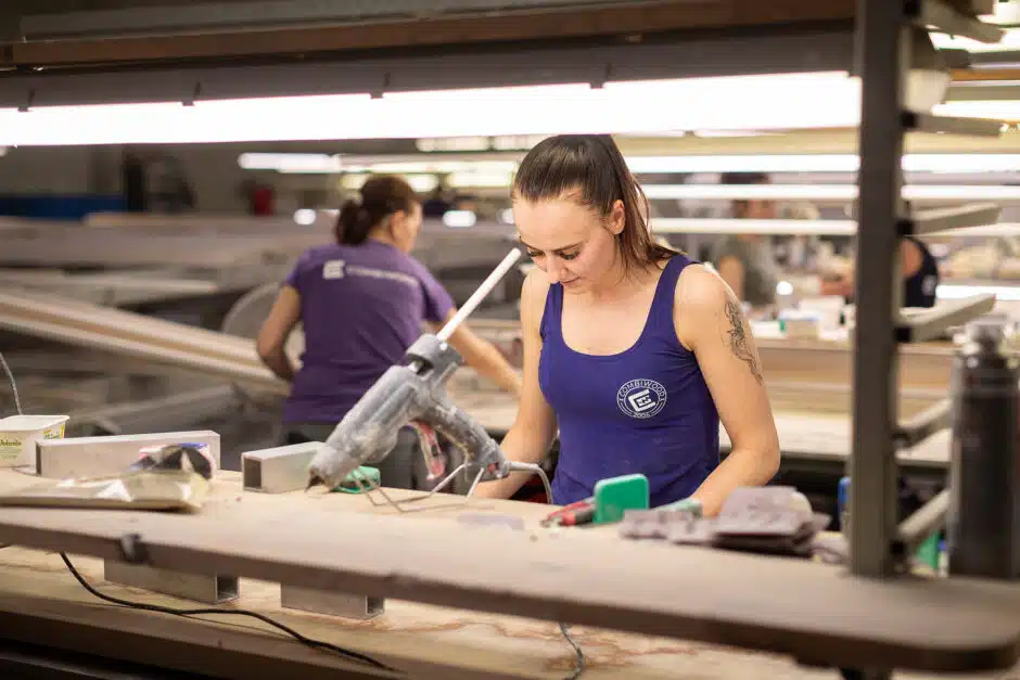 After plastering and moving through a drying oven, the strips are sorted and any strips that need to be repaired manually are separated. Because so much work has been put in and the material is expensive, it is important to repair every defective strip. Hand plastering is a difficult job that must be done with great care to ensure that no defects remain visible underneath the paint after finishing. We have to do this when there are resin pockets or tears left by planing that cannot be repaired by machine.